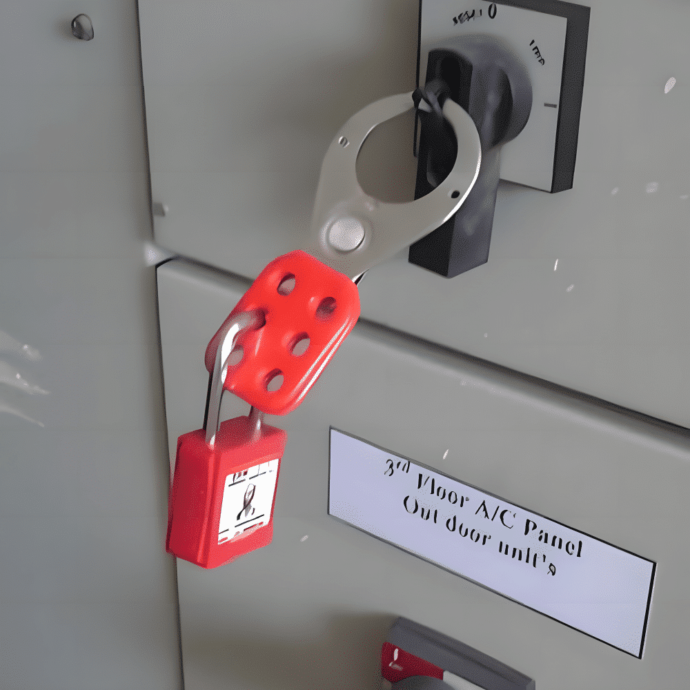 ขั้นตอนที่ 1 ปิดการทำงานงาน : ปิดการทำงานของแหล่งพลังงาน เช่น สวิตช์ เบรกเกอร์ หรือวาล์ว จากนั้นติดตั้ง Lockout Hasps ที่จุดล็อคของแหล่งพลังงานนั้น เพื่อป้องกันการเปิดใช้งานโดยไม่ได้รับอนุญาต