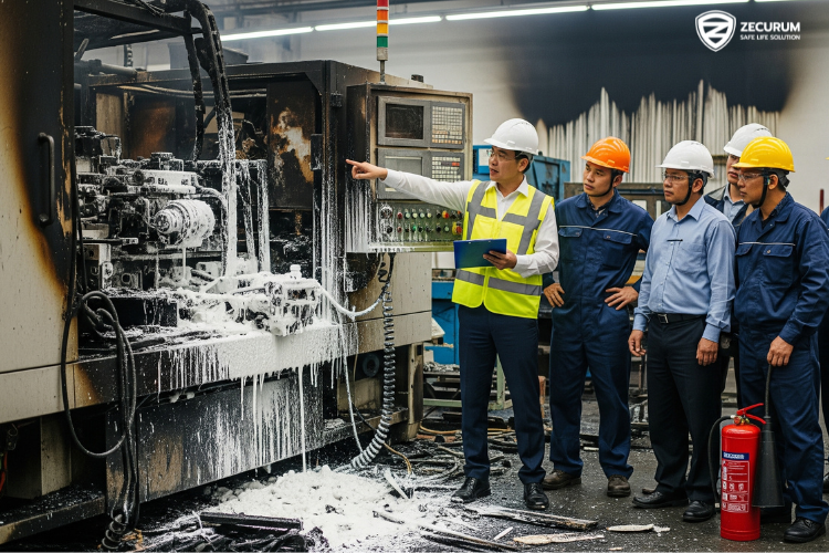 - ถังดับเพลิงแบบผงเคมีแห้งทิ้งคราบฝุ่นและผงเคมีกระจายไปทั่ว ทั้งบนพื้น โต๊ะทำงาน และภายในเครื่องจักร คราบเหล่านี้ซึมเข้าสู่แผงวงจร เสียเวลาซ่อม และอาจต้องเปลี่ยนอะไหล่ราคาแพง