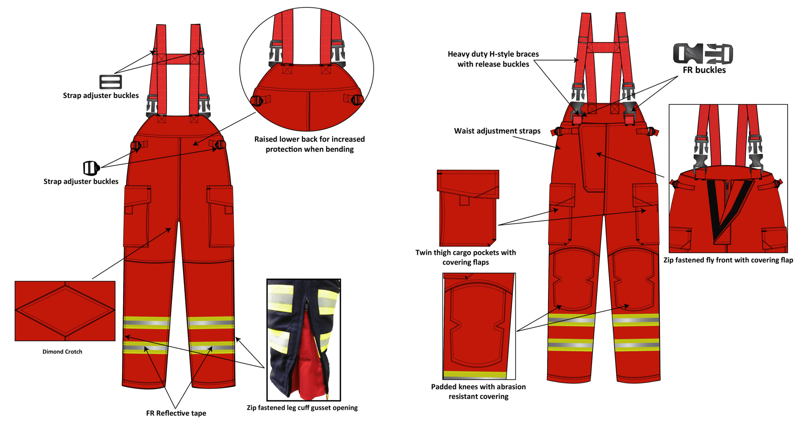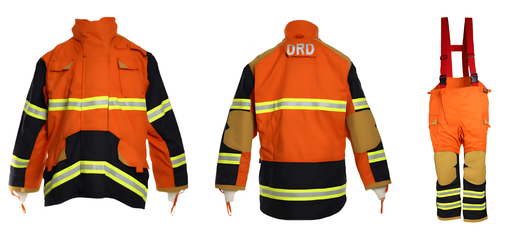 • เสื้อและกางเกงดับเพลิง : ผลิตจากวัสดุที่ทนไฟ เช่น ผ้า Jackal, Nomex,Pararich, Kevlar, หรือผ้าเคลือบสารกันไฟ มักมีแถบสะท้อนแสงเพื่อเพิ่มการมองเห็นในสภาพแสงน้อย